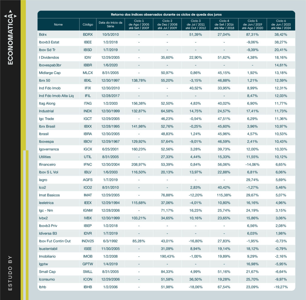 Tabela completa da performance de todos os índices observados ao longo dos 6 ciclos de queda de juros: