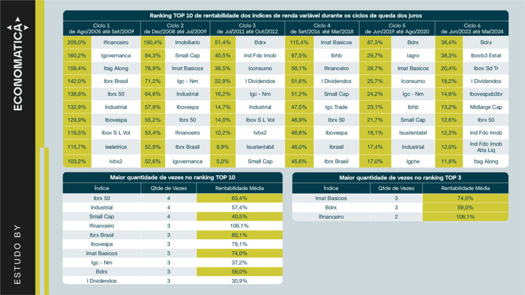 A tabela a seguir apresenta o ranking dos índices de renda variável com maior rentabilidade acumulada em cada ciclo de queda da Selic.