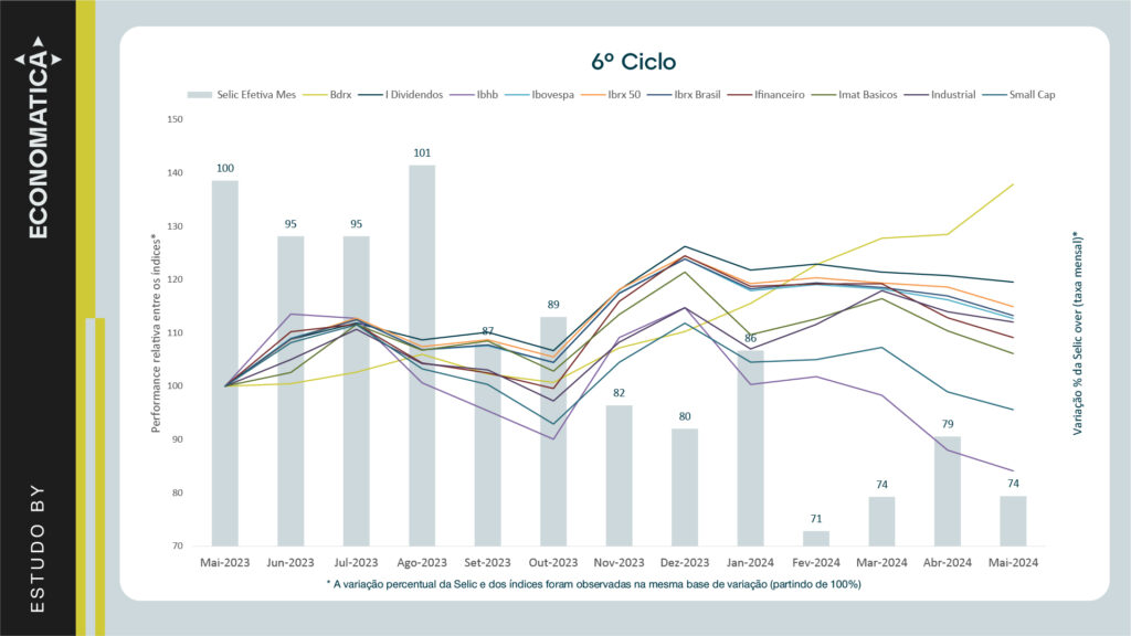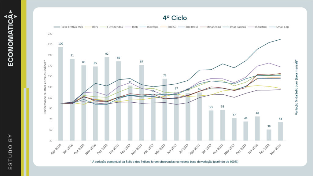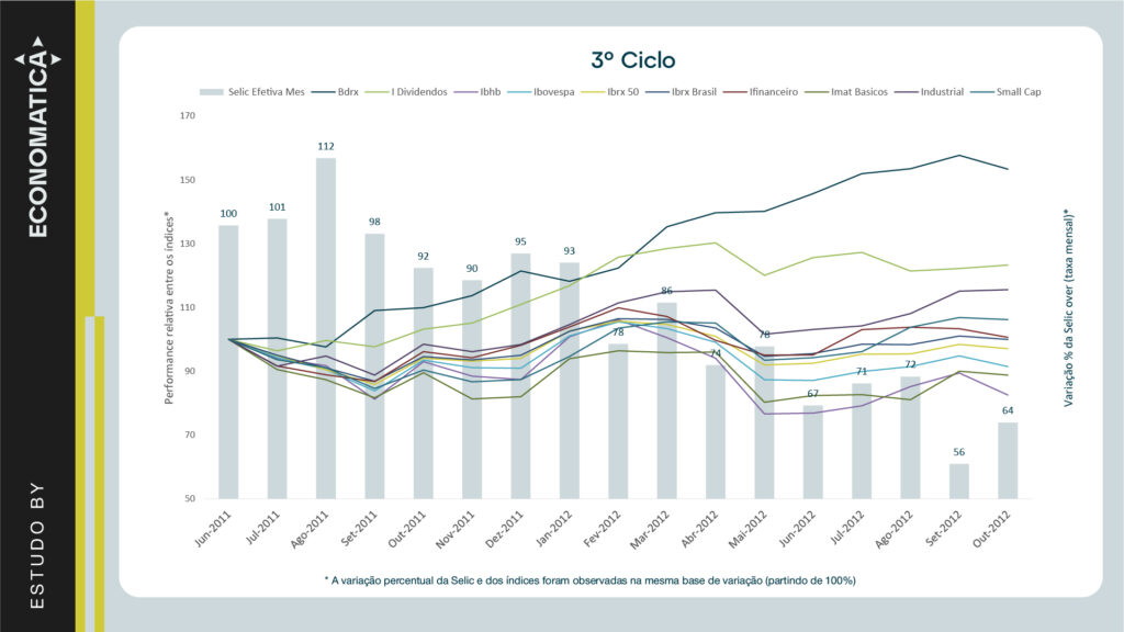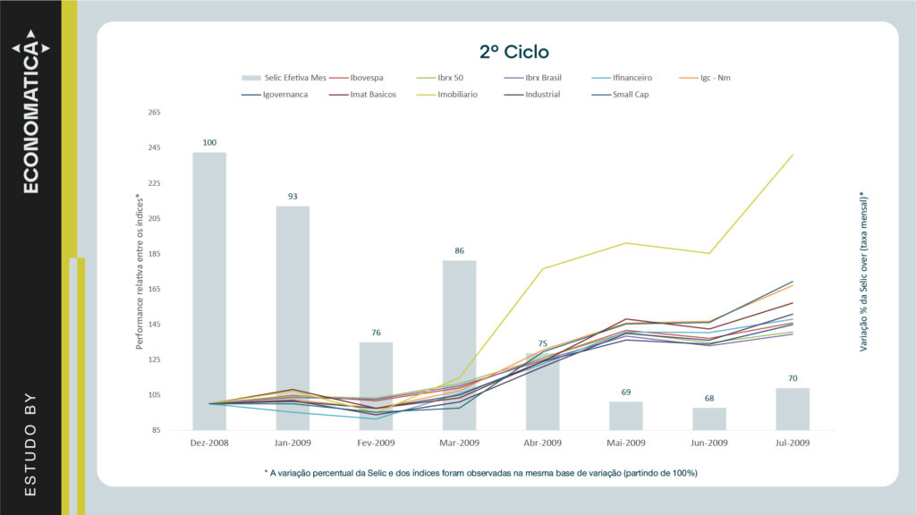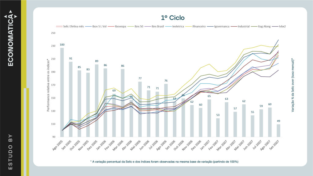 A seguir, são apresentados os gráficos comparativos da variação percentual da Selic over mensal partindo de uma base 100 para demonstrar o % de variação da taxa ao longo dos meses observados e da performance relativa dos índices de renda variável que apresentaram os maiores retornos em cada ciclo: