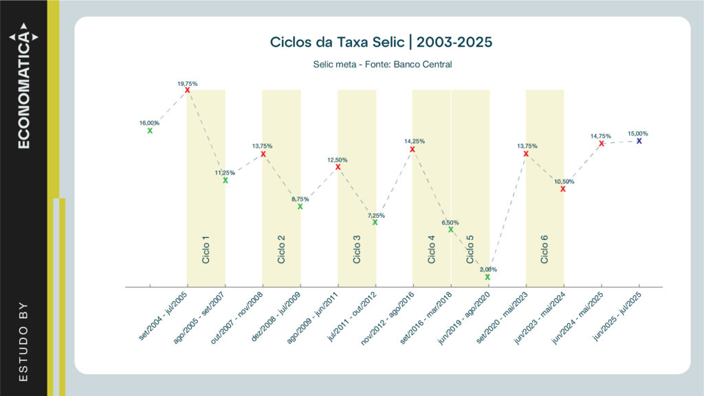 Conforme ilustrado no gráfico abaixo, entre 2003 e 2025 foram identificados seis grandes ciclos de redução da taxa Selic, cada um refletindo diferentes contextos econômicos e políticas monetárias adotadas pelo Banco Central.