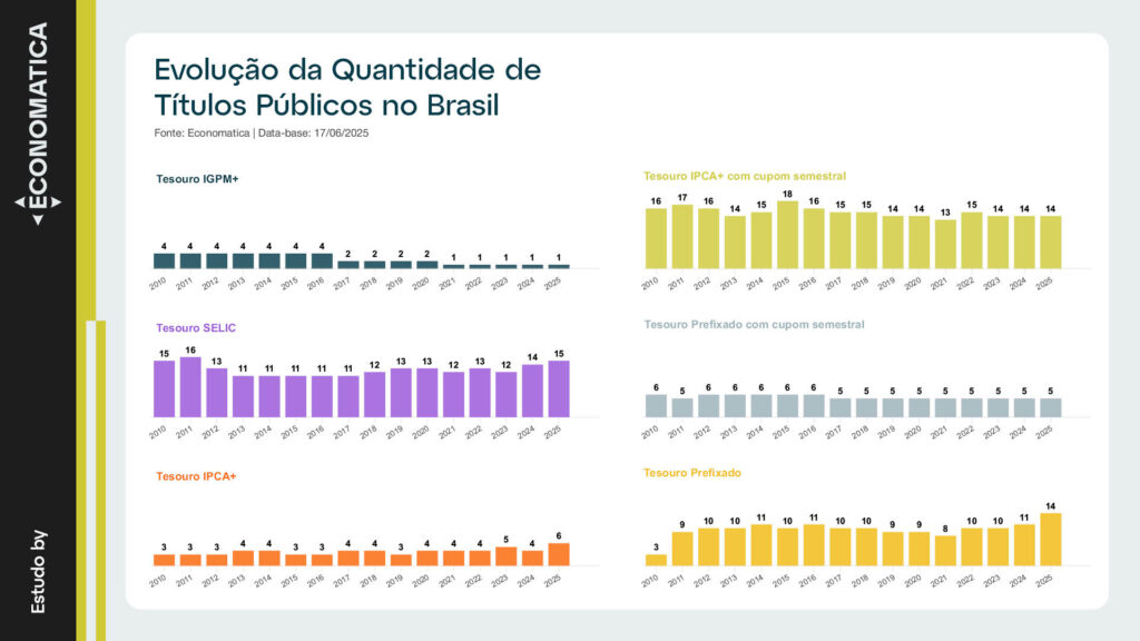 O gráfico abaixo apresenta a evolução da quantidade de títulos públicos emitidos no Brasil desde 2010. Observa-se uma variação entre 40 a 50 títulos ativos por ano, reflexo tanto do aumento da necessidade de financiamento do governo quanto da estratégia de alongamento da dívida pública e diversificação de instrumentos.