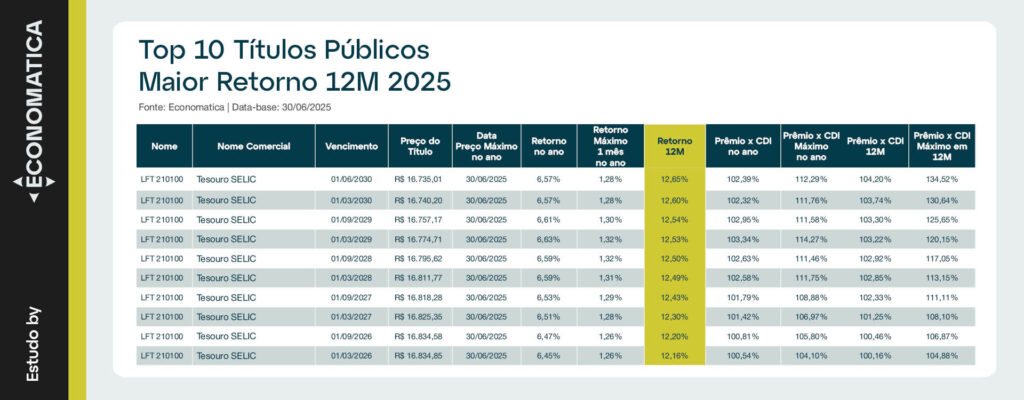 A tabela apresenta um ranking dos 10 títulos públicos com maior retorno acumulado em 12 meses até 30/06/2025, todos pertencentes à família Tesouro Selic (LFT 210100), mas com diferentes datas de vencimento entre 01/03/2026 e 01/06/2030.