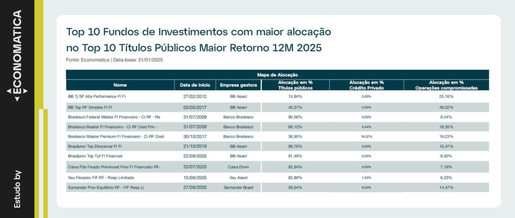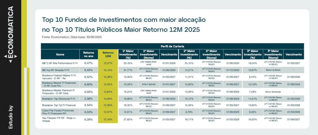 A tabela abaixo apresenta os 10 fundos de investimento que possuem maior alocação nos Top 10 títulos públicos com maior retorno em 12 meses.