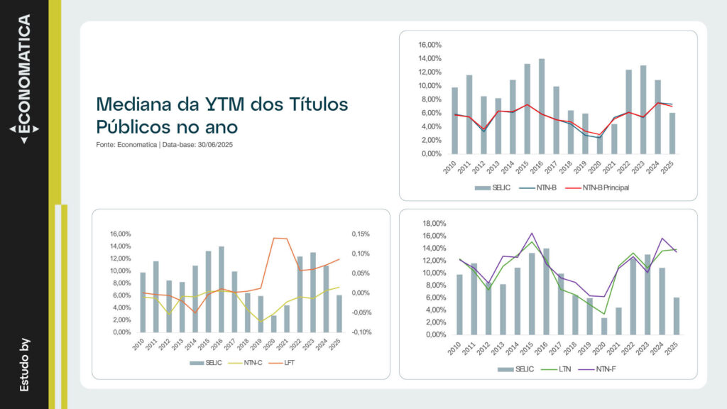 O gráfico abaixo apresenta a evolução da mediana do YTM (Yield to Maturity) dos títulos públicos entre 2010 e 2025. A mediana do YTM representa o retorno esperado, em termos percentuais ao ano, para quem adquirir os títulos públicos naquele momento e os levar até o vencimento.
