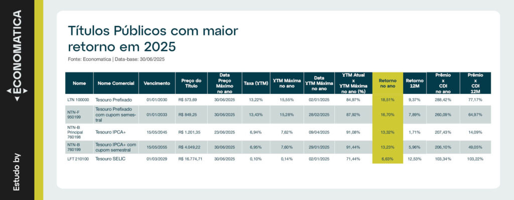 A tabela abaixo apresenta o título com maior retorno em 2025 em cada classe de título público no fechamento de 30/06/2025. Observou-se que os títulos prefixados apresentaram maior retorno no ano dentre as classes analisadas, refletindo o prêmio de risco exigido pelo mercado diante das incertezas fiscais e do cenário eleitoral próximo.