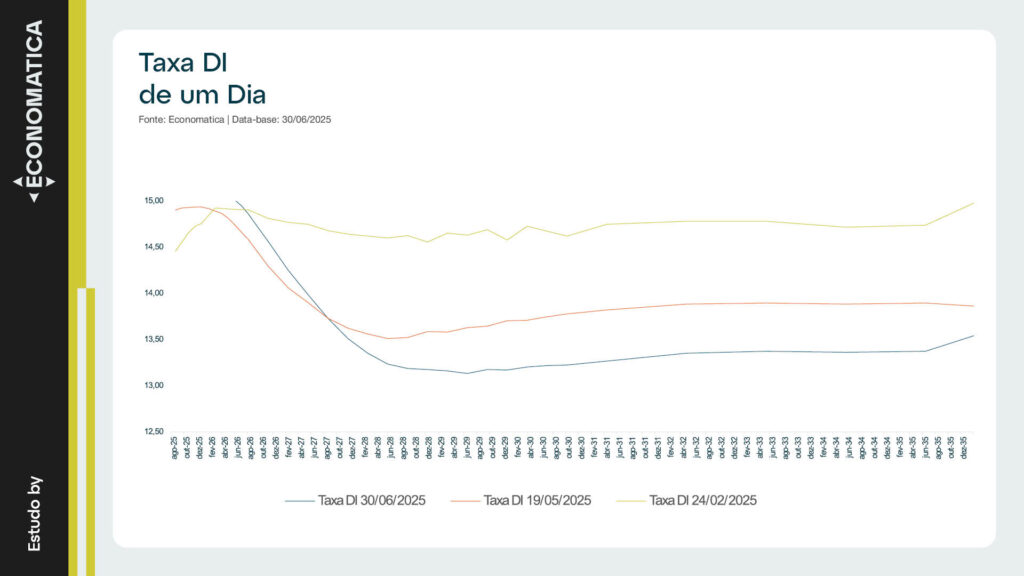 O gráfico da taxa DI de 1 dia mostra a evolução da curva do custo do dinheiro no mercado interbancário nos contratos de juro futuro nas datas de 24/02/2025, 19/05/2025 e 30/06/2025. Essa taxa representa o juro efetivo praticado entre instituições financeiras em operações de curtíssimo prazo, refletindo a expectativa da trajetória da taxa Selic. Por isso, o DI se consolidou como importante referência para a precificação de diversos ativos de renda fixa no mercado brasileiro.